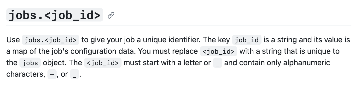 이제 Actions에서 실행할 Job을 정의해야한다. job은 jobs필드에 정의해야한다. 기본적으로 모든 job은 <job_id>를 정의해 주어야 한다. <job_id>는 각각의 job에 대한 Unique ID이다. 즉 각각의 job들은 서로 다른 이름을 가지고 있어야 한다.(링크)