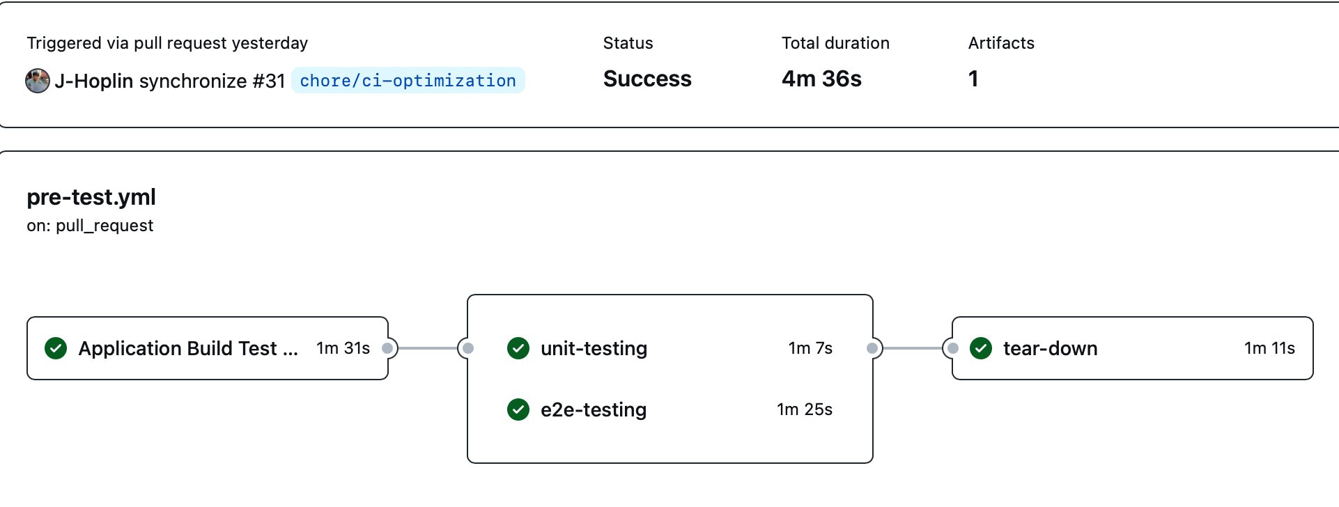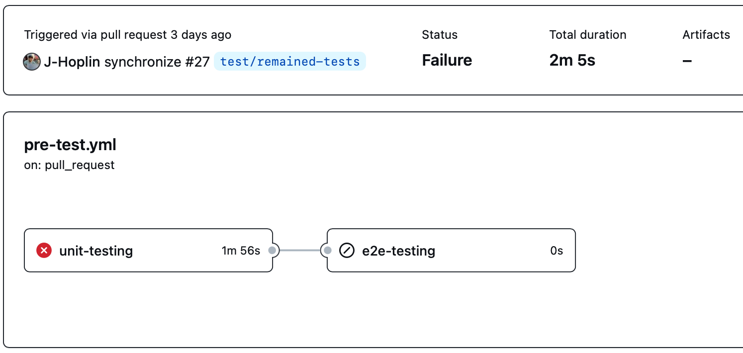 기본적으로 e2e-testing Job은 unit-testing Job에 의존적이기 때문에, unit-testing이 실패하면 동작을 멈춘다.