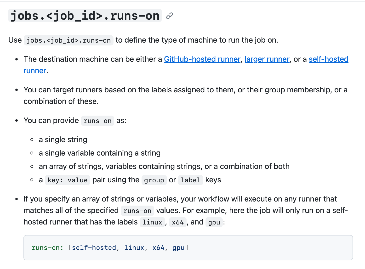 이제 각각의 Job이 실행될 Runtime 환경을 정의해 주어야한다. Runtime 환경은 jobs.<job_id>.runs-on에 정의해야한다. 필자는 Ubuntu Runtime을 활용할 것이며, 최신버전을 사용할 것이다. 필요에 따라 버전을 명시할 수 있다.(ubuntu-latest로 지정하면 최신버전의 Ubuntu를 사용한다.)