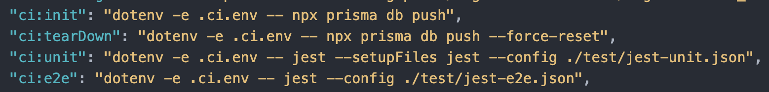 현재 프로젝트에서는 CI 환경에서 테스트를 위해서 .ci.env로부터 환경변수를 불러오도록 npm scripts를 작성하였다.
