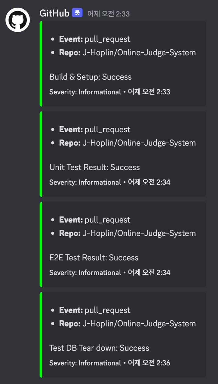 들어가기 앞서 이 시리즈는 결론적으로 아래 사진의 Github Actions Flow를 작성할 것이며, 각각의 단계에 대해서 Discord 알림이 가도록 설정할 것이다.