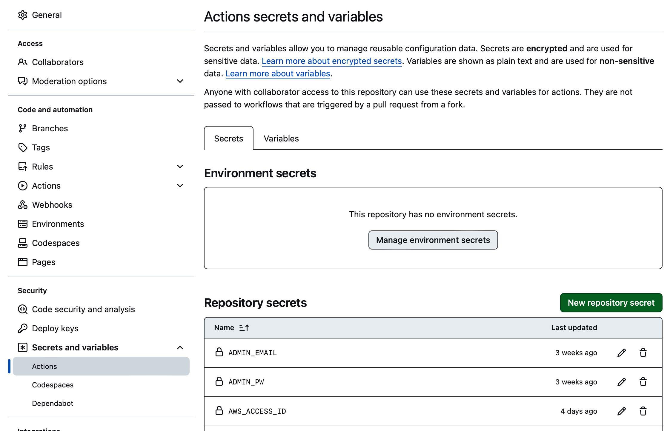 .ci.env는 Github Actions의 secrets 컨텍스트를 활용하여 작성한다. secrets컨텍스트는 Workflow에서 활용할 수 있는 Secret값들을 의미하며, API Key와 같이 중요 환경변수들을 사용하기 위해 사용한다. secrets 컨텍스트에 들어가는 환경변수들은 Repository Setting에서 정의할 수 있다.
