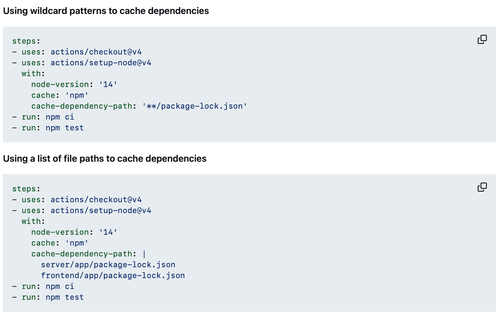 만약 package.json이 프로젝트 루트 디렉토리에 없거나 여러개를 활용하는 경우에는 cache-dependency-path필드를 통해 경로를 지정해준다.(Docs)