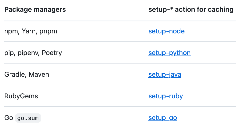 Cache Actions를 직접 사용해도 좋지만, 만약 기존 프로그래밍 언어 런타임 Setup Action을 사용한다면 각 Action에서 내부적으로 Cache Actions를 활용해 캐싱을 지원한다. 아래 사진은 지원되는 Setup Action 리스트들이다.