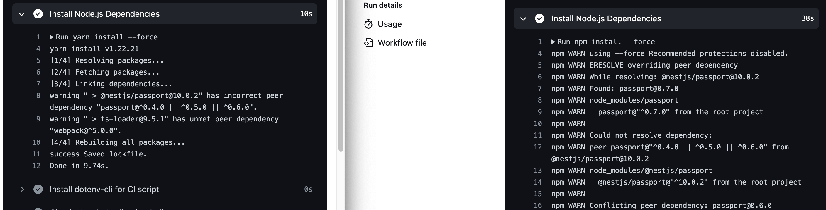 다른 Job에서는 적용하지 않은 이유는 의존성 설치에서는 Build & Setup Job에서만 이루어지고 이 Artifact를 통해 다른 Job들에게 공유하는 방식으로 설계하였기 때문이다. 적용 후에 비교를 해보면 의존성 설치 step에서 실제로 약 30초정도의 시간 감소 효과가 있는것을 볼 수 있었다.