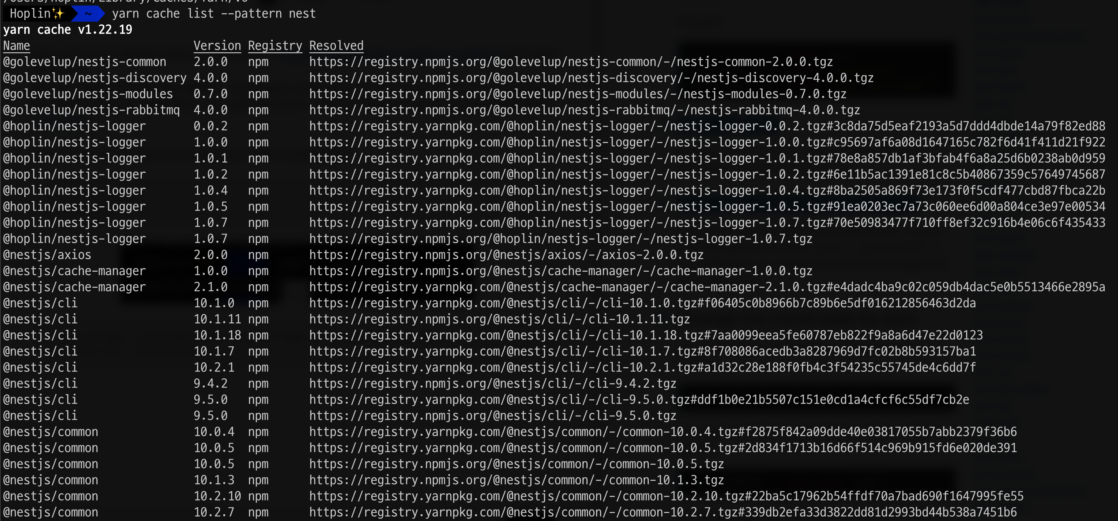 // Yarn 캐시 출력. --pattern을 추가하면, pattern의 이름을 가진 패키지들에 대한 캐시를 불러온다.
