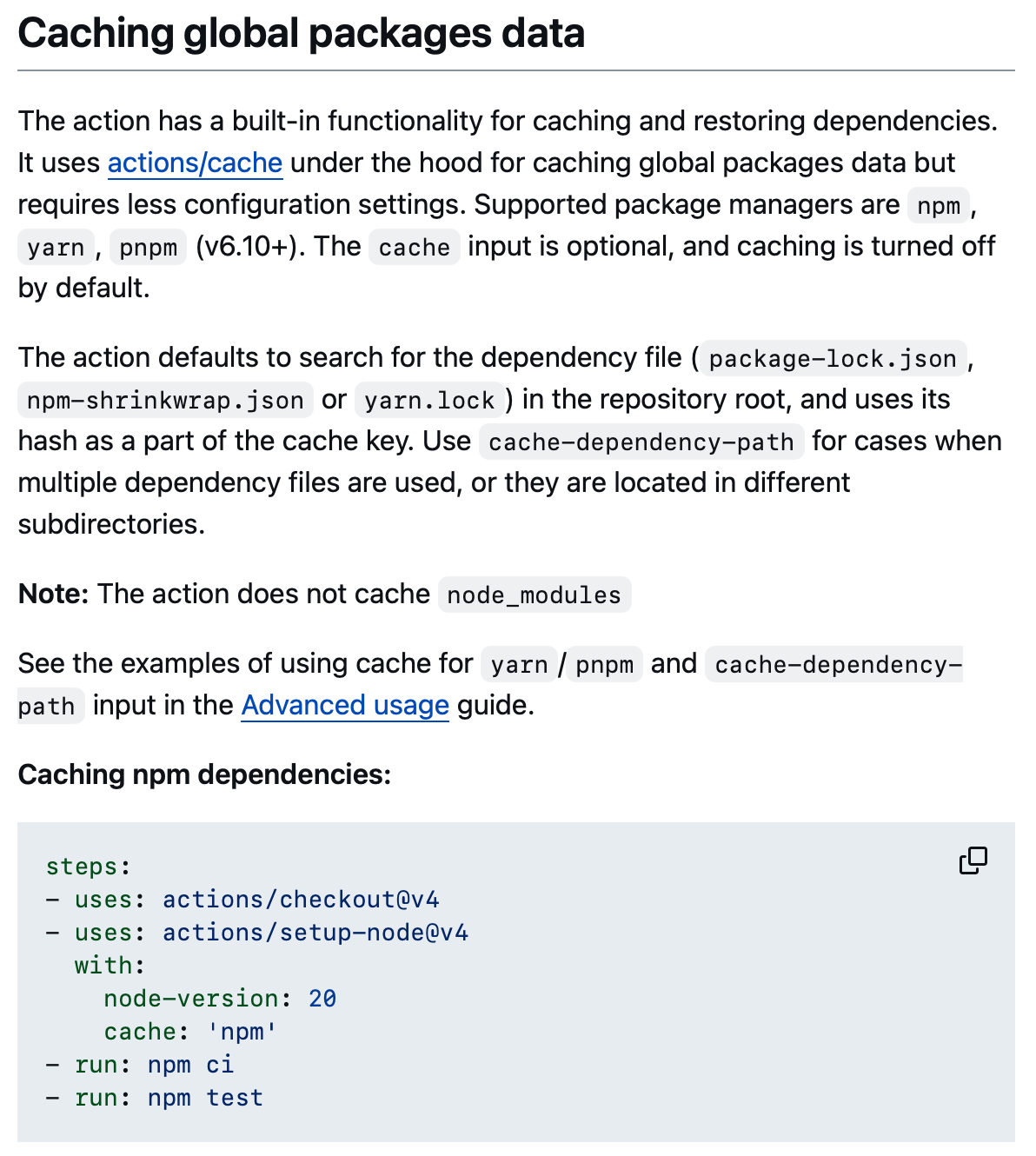 필자의 프로젝트에서 활용하는 Setup Node의 Caching global package data를 참고하자. 이 문서를 보면 actions/setup-node@v4에 cache필드(optional)에 사용할 패키지 매니저를 지정해주면된다.(npm, yarn, pnpm만 지원) 이를 활용하면 종속성 파일(pacakge-lock.json, yarn.lock)을 검색한 후 종속성 파일의 해시를 캐시 키의 일부로 사용한다.